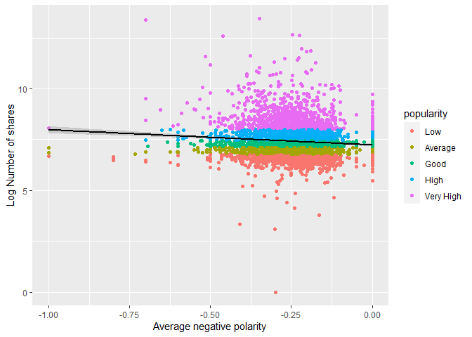 These plots attempt to find the trend of log of shares as a function of average positive and average negative polarity. If we see that the number of shares increases or decrease with the increase in the polarity of the content, then we can infer the trend from the slope of the linear regression line on the plots given below.