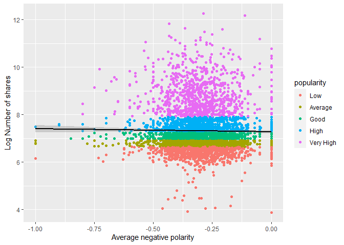These plots attempt to find the trend of log of shares as a function of average positive and average negative polarity. If we see that the number of shares increases or decrease with the increase in the polarity of the content, then we can infer the trend from the slope of the linear regression line on the plots given below.